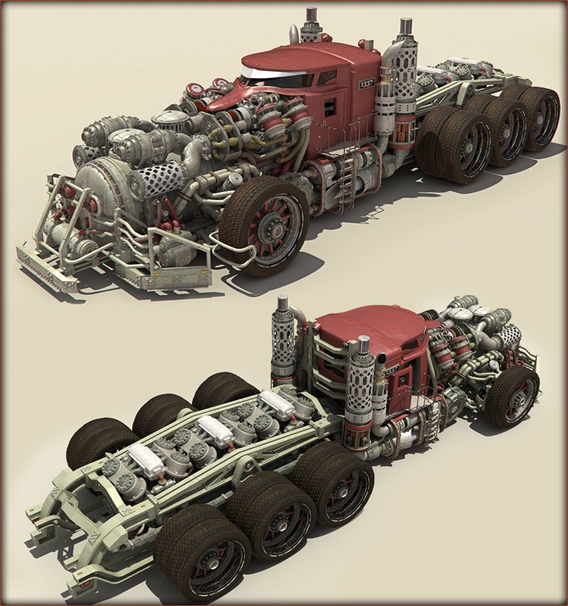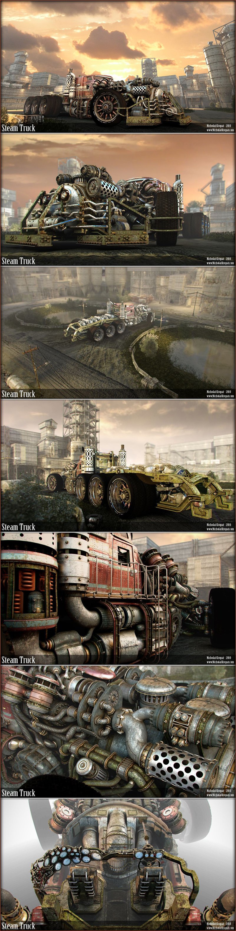 The Steam truck has been a long running  personal project that I have finally completed (for now).  The truck  started as a series of sketches that I did in 2008.  I wanted to  create a truck styled steam locomotive that would function as a  trackless land train.  After some detailed sketches and a few quick  block-models I quickly realized this was going to be a very involved  and fun project, and set about packing as much detail as I possibly  could into this monster of a truck.