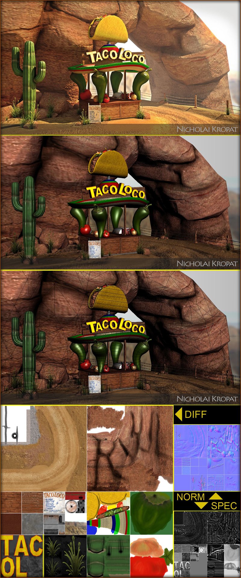 Recently completed art test for a game studio in Texas. Though a job   didn't come out of it, I had a lot of fun with this project because it   was so far out of my usual themes.  The test guidelines were: Create a food stand around your favorite food 7000 tris max 1024x1024 total texture space per map type 1 week time limit I wound up with 6999 tris, 1024 diffuse, normal, spec, alpha and SI, and it took me 6 days.  |