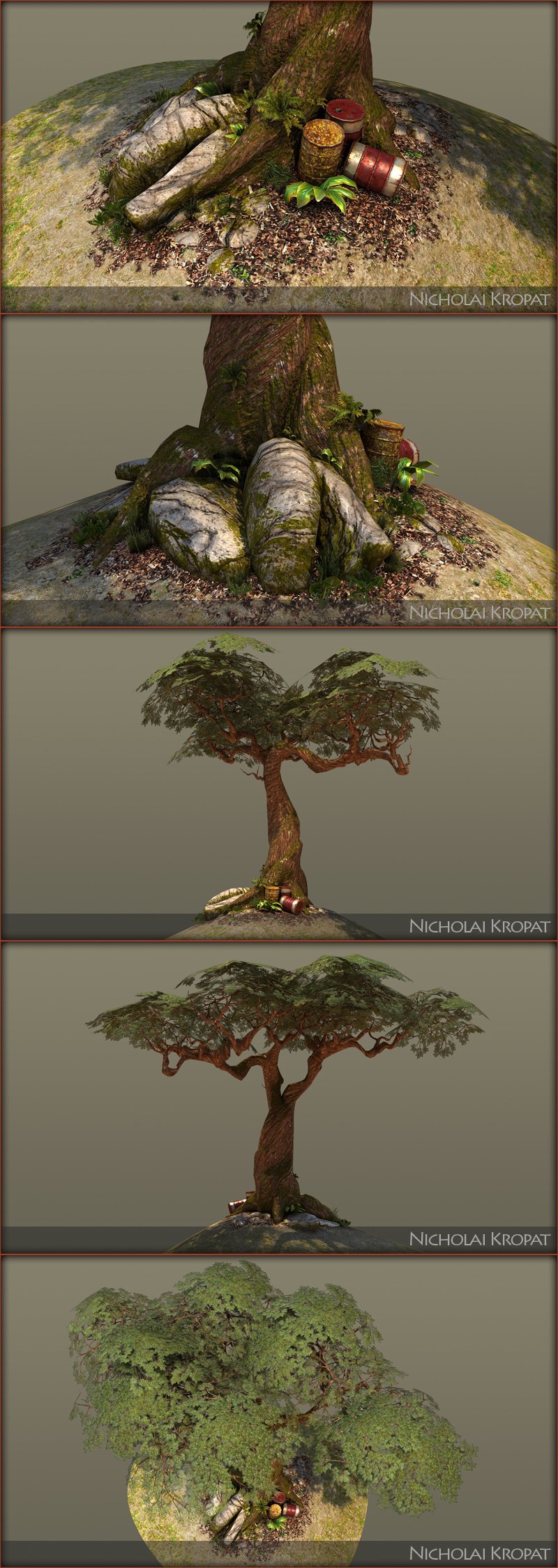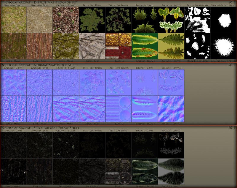 Environment Texture test for NaughtyDog 14 total 512x512 map sets Model Provided - All maps hand painted in Photoshop and Zbrush. In total I created 7 seamless tiling map sets with Diffuse, Normal and Specular, and 7 non tiling map sets for the foliage and details. Blend masks were used to combine multiple tiling sets to increase detail without loosing detail.  |